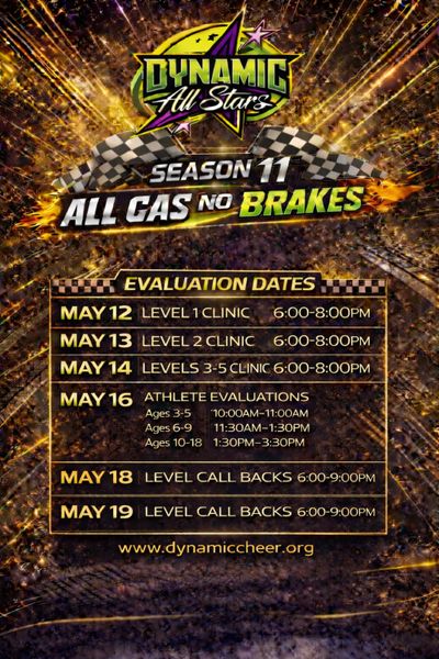 Dynamic All Stars offers clinics throughout the year to support athlete growth and development. Our level‑based clinics are designed specifically for athletes registered for Season 11. Each clinic focuses on essential skills including conditioning, stretching, jumps, and tumbling, helping athletes build strength, confidence, and strong technique.